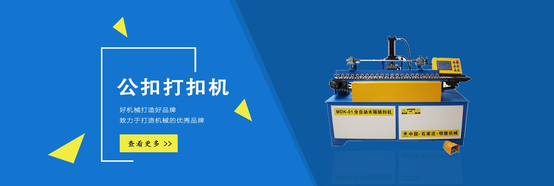 石家莊明德包裝機械有限公司,是國內專業生產木箱雙條鋼帶機、美式托盤打釘機械、托盤刨槽機、倒角機、木包裝箱、木托盤的生產廠家,目前擁有廠房3000多平方米,自動化生產設備數十套。 公司下轄包裝機械事業部,主要生產新型全自動木箱鋼帶機、全自動(半自動)木箱鎖扣機、折疊鋼帶箱機械、鋼帶箱壓板機、美式托盤自動打釘機、托盤刨槽機、倒角機等相關鋼帶木箱機械、木工機械、配套產品,設備主體部分由高品質機械和高精度模具組成,液壓系統、伺服系統和低壓配電單元的主要元器件,均選用西門子、施耐德等國際和國內產品,大大提升了產品質量,設備長時間運行穩定可靠,獲得了用戶的一致好評。 公司下轄包裝制品事業部,主要生產各種實木木箱、膠合板鋼帶木箱和實木熏蒸托盤、歐標托盤、美標托盤、亞標托盤及相關配套產品,木箱和托盤均選用優質九厘板材和俄羅斯原木作為原材料,從生產制造、成品組裝、出廠質檢到送貨上門,售后服務等,做到一條龍服務,始終堅持“把質量做到更好,把成本降到更低,把實惠讓給客戶“的經營原則。